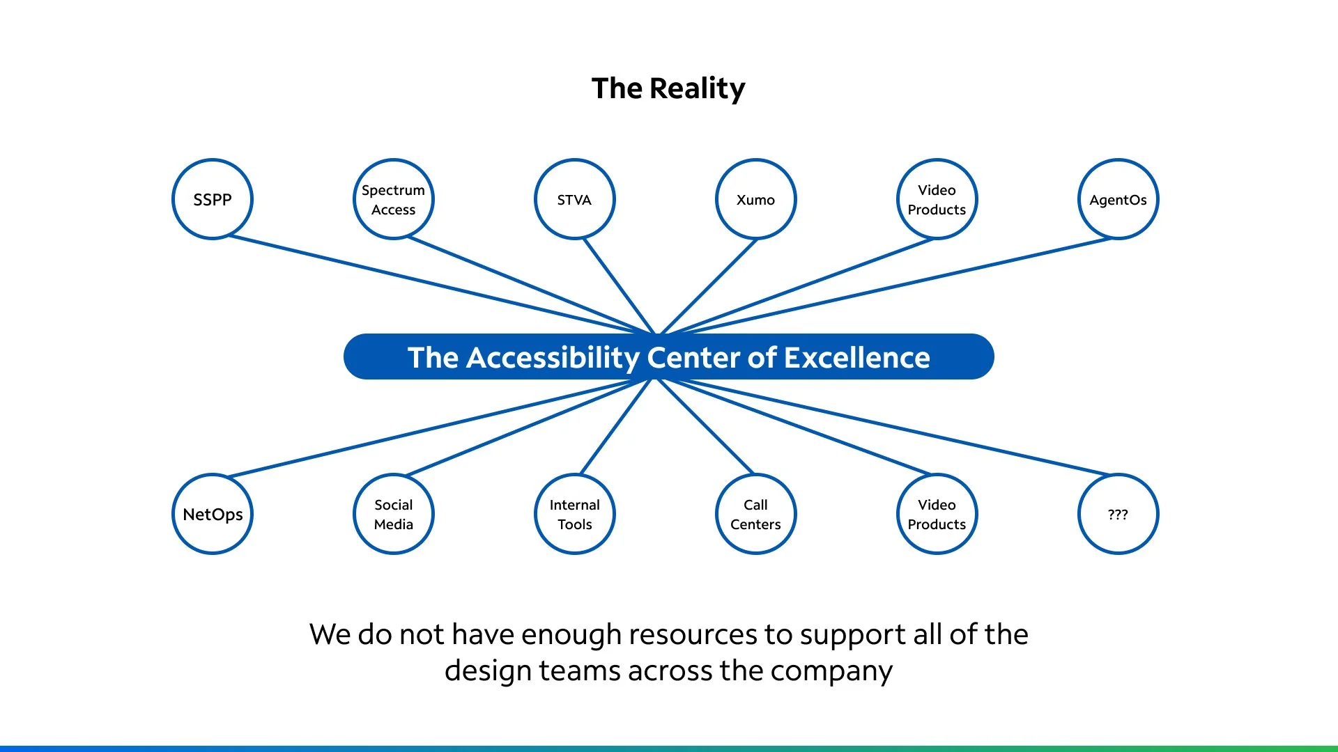 At Spectrum we have a small group of 25 supporting over 80 product teams! My specialty is accessible web design. I decided it was time to stop giving fishes and start teaching them how to fish. My approach is a hub and spoke model and is being implemented successfully as of August of 2024. Below you can view the case study slide deck. Please feel feee to request and accessible, downloadable PDF version.